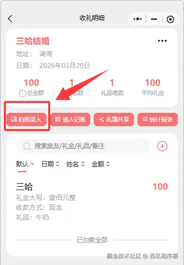 或者在首页-礼薄本-收礼明细-拍照录入:点击按钮进入拍照识别页面。