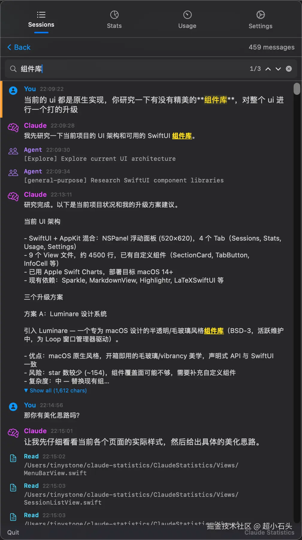 我之前写过几个小工具,对 SwiftUI 和 AppKit 都有一些了解。这件事对我来说技术上不算太难,难的是找到时间把它做完整。最终花了几个周末,把这个叫 Claude Statistics 的应用做出来了,MIT 开源放到了 GitHub 上。