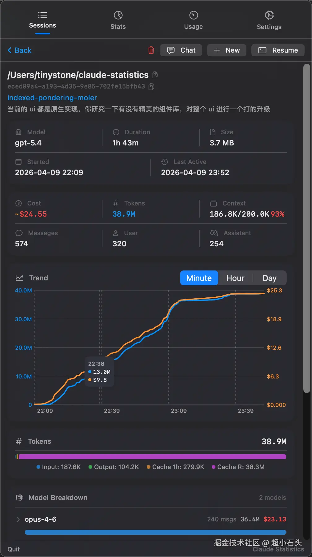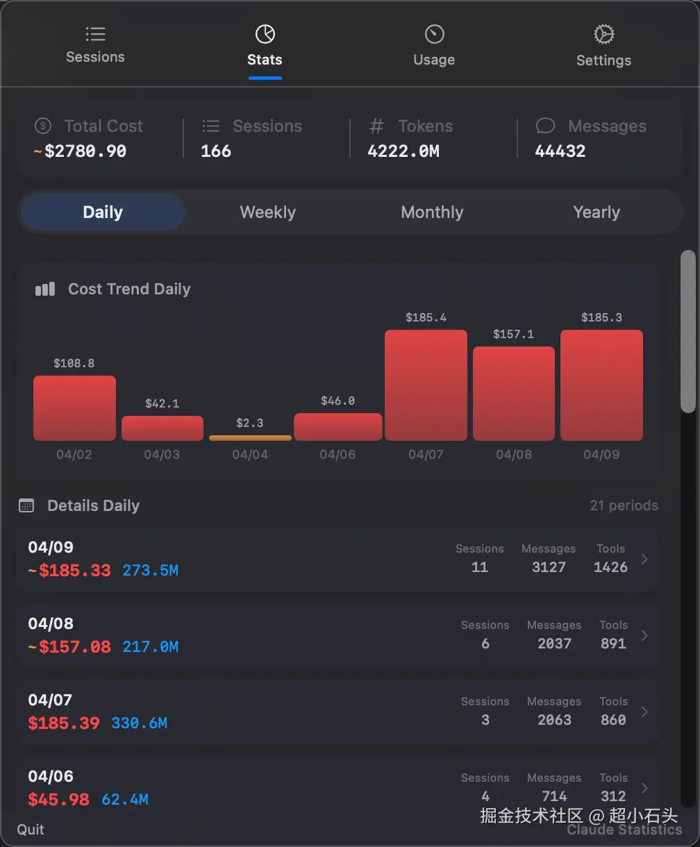 数据来源这边,Claude Code 把所有对话存在 ~/.claude/projects/ 下,每个项目一个目录,每个 session 一个 JSONL 文件。每行是一条记录,包含 token 使用量、模型名称、时间戳等字段。我用 Swift 的 JSONDecoder 逐行解析,提取出每个 session 的 input/output token、cache write/read token,然后乘以对应模型的单价,算出成本。
