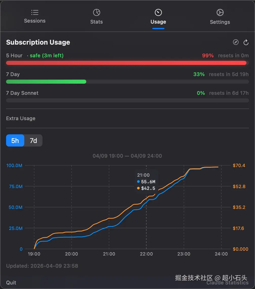 更让我担心的是另一个情况:有时候 Claude Code 突然开始变慢,响应变简短,我才意识到可能触到了速率限制,但到底还剩多少额度、什么时候会恢复,我得自己去算、去猜。作为一个每天依赖它写代码的人,这种"开盲盒"的感觉实在不好受。