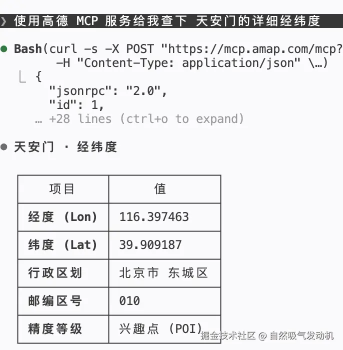 然后我们直接在控制台就可以向 cluade 提问,可以发现过程中已经使用了高德的地理编码接口: