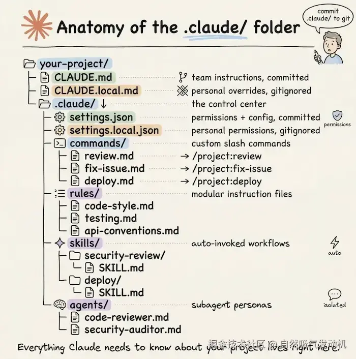 本节知识点的内容用下面的这个图来做下总结(图片来源自:blog.dailydoseofds.com/p/anatomy-o…)这两张图里详细介绍了项目实践中怎么去管理和定义.claude 文件夹的内容,协助整个团队提升效率和统一规范。