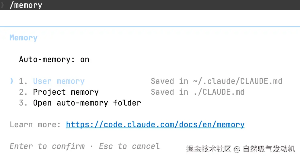 Memory 则是在 Claude 在对话中自动记下来的碎片信息——你纠正过它什么、你喜欢什么工作方式之类的。保存在 ~/.claude/projects/ 目录下,用 /memory 命令管理。