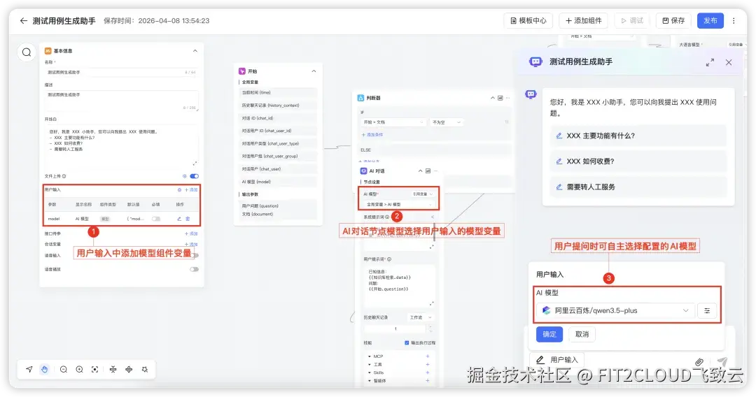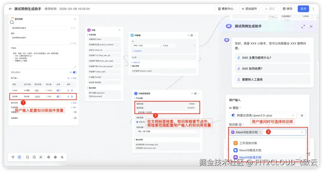 在MaxKB v2.8.0社区版本中,高级智能体的用户输入功能中新增模型与知识库组件。用户在问答页面对话时,可以自主选择配置的模型及待检索的知识库,从而有效提升对话的精准度与灵活性。