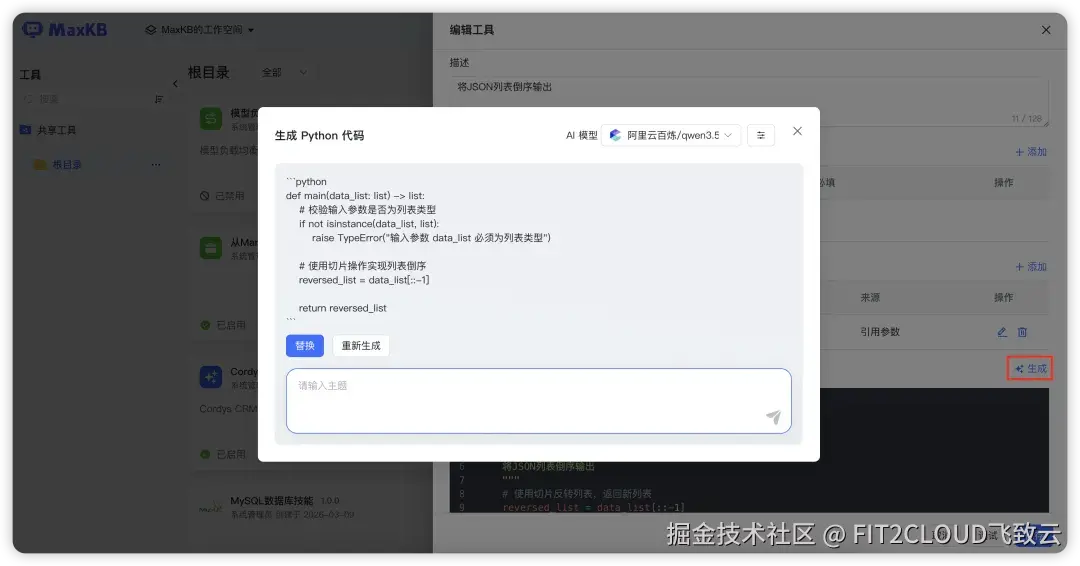 MaxKB v2.8.0社区版支持脚本工具自动生成Python代码的功能。用户可以根据工具的名称、描述和参数,使用模型直接生成对应的Python代码,无需手动编写,大幅降低了工具的开发门槛。