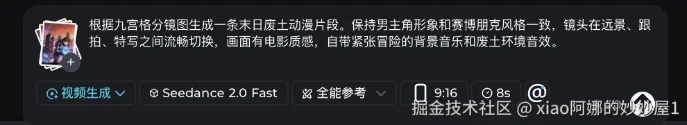 | 根据九宫格分镜图生成一条末日废土动漫片段。保持男主角形象和赛博朋克风格一致,镜头在远景、跟拍、特写之间流畅切换,画面有电影质感,自带紧张冒险的背景音乐和废土环境音效。 |