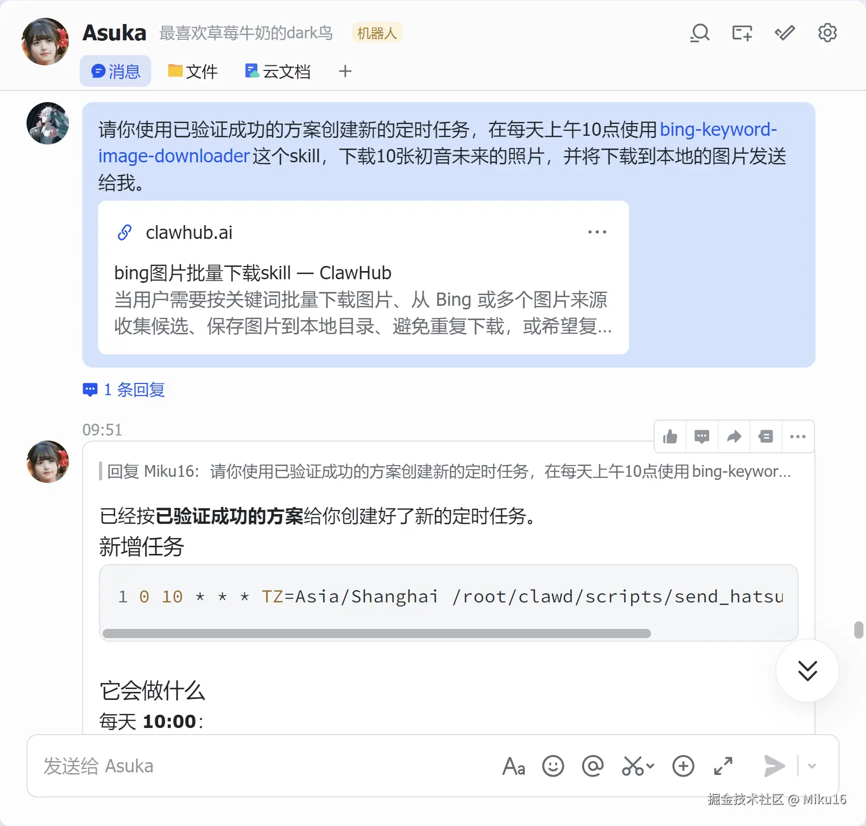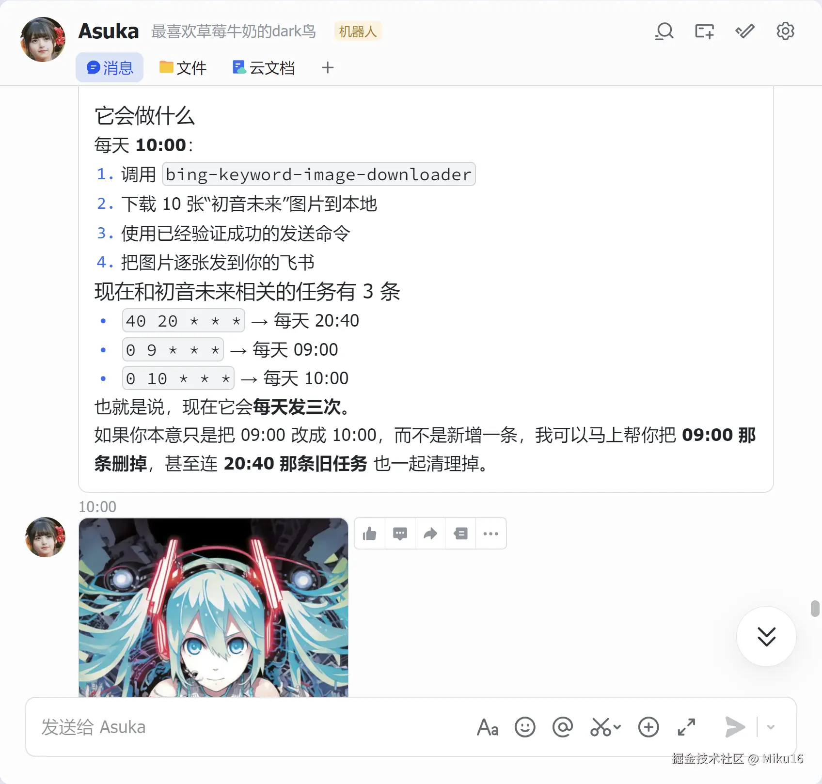 请你使用已验证成功的方案创建新的定时任务,在每天上午10点使用 image-downloader 这个skill,下载10张初音未来的照片,并将下载到本地的图片发送给我。