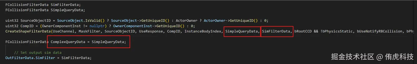 在CreateShapes函数中,会对碰撞数据进行编码,并且生成三个FCollisionFilterData实例,存储不同用途的物理碰撞信息。