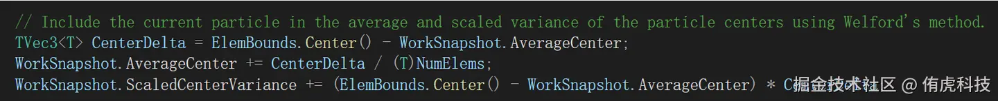 一次性构造一整棵树有个好处,就是能让左右子树尽量空间上均衡,提升之后的查找效率。如果是Dynamic那样一个一个节点的插入,树的质量和节点插入顺序是有关系的。那么重点就是对于一群AABB节点,如何合理地划分左右子树。回想在构造BVH时,有两种常用划分方法,一种是在XYZ三个方向里选取Max-Min最大的一个作为划分轴,然后取中点划分;另一种是SAH表面积启发算法,同样是考虑XYZ三个轴,但在每个轴上要计算多种表面积划分组合,再选取某个能使Cost最小的位置做划分,计算量更大,但效果也更好。UE的AABBTree使用了更接近前者的简单做法,但不会取Max-Min最大的作为划分轴,而是计算每个轴上AABB 中心点形成的方差,取方差最大的轴作为划分轴。计算中心点和方差的代码如下,使用了流式数据常用的Welford算法。