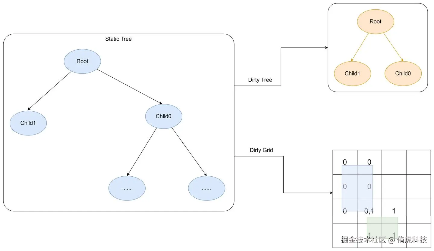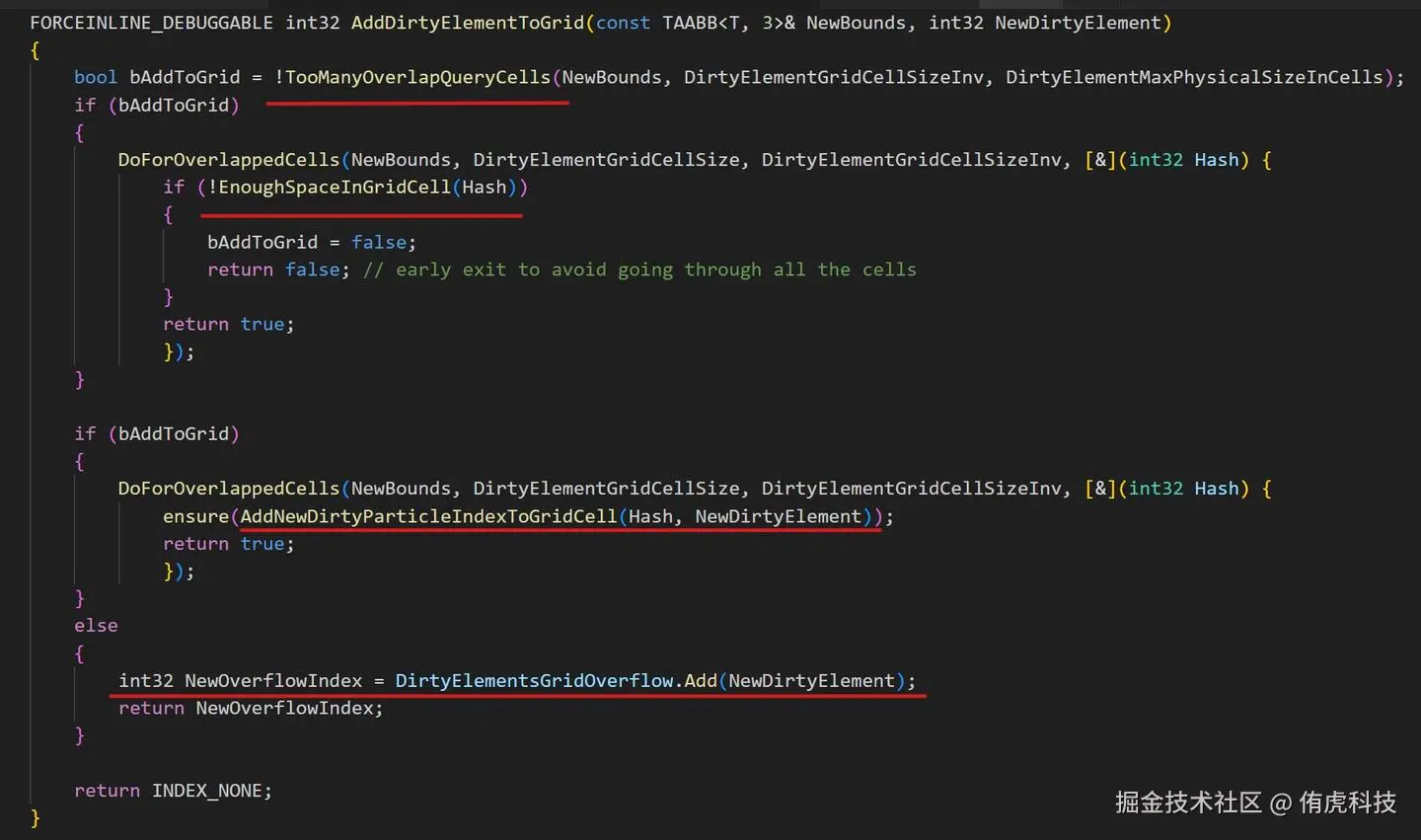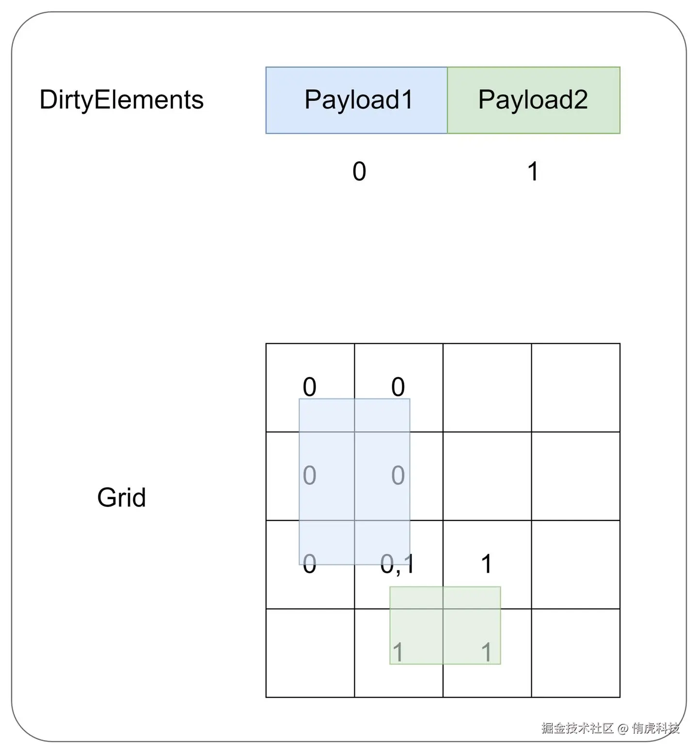 Grid的每个Cell大小为CVarDirtyElementGridCellSize,默认1000,如果一个Payload和某个Cell重叠,该Cell就会把Payload的DirtyPayloadIndx记下来。