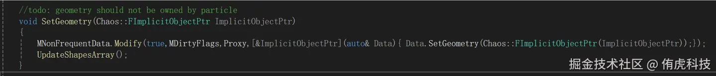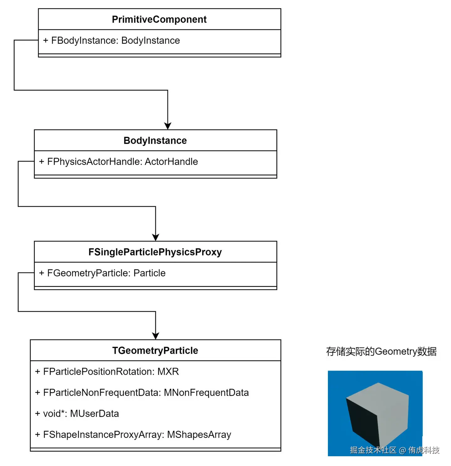 看声明代码,等价于FSingleParticlePhysicsProxy*,既然叫XXProxy,那就是一个代理的作用。一个需要进行物理解算的对象在物理引擎内被称为一个Particle,是一个约定俗成的名字,该类作为其代理充当与物理交互的接口。物理引擎只关注一个物体的几何形状、位置、以及质量等属性,它们由TGeometryParticle持有。PhysicsActorHandle的TGeometryParticleHandle属性指向了GeometryParticle,实现关联。不仅如此,TGeometryParticle内部还有一个指向更底层物理SOA存储的FGeometryParticleHandle,暂时用不到,先不管。概念比较多,之后会做总结。