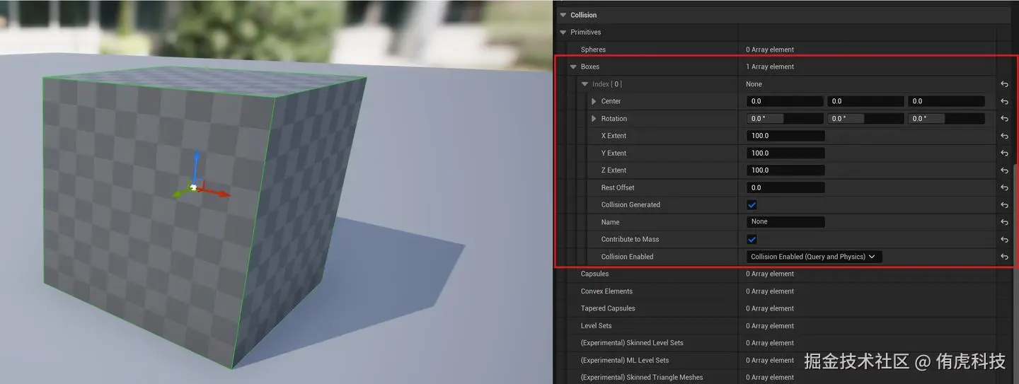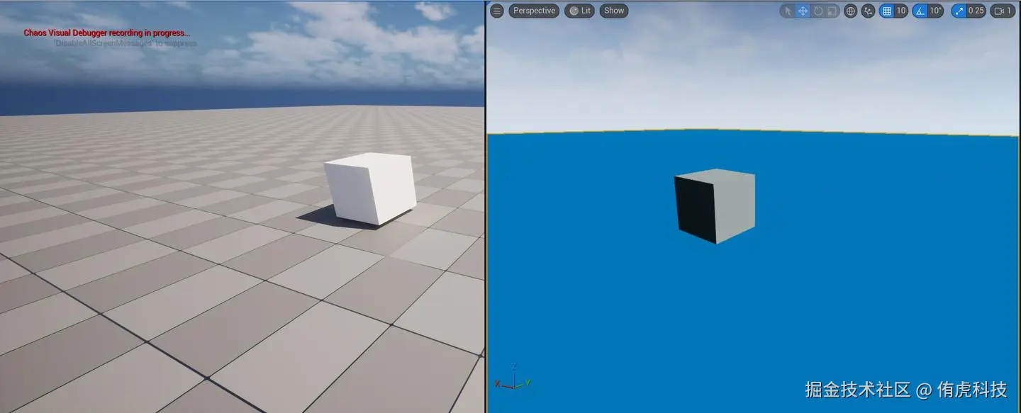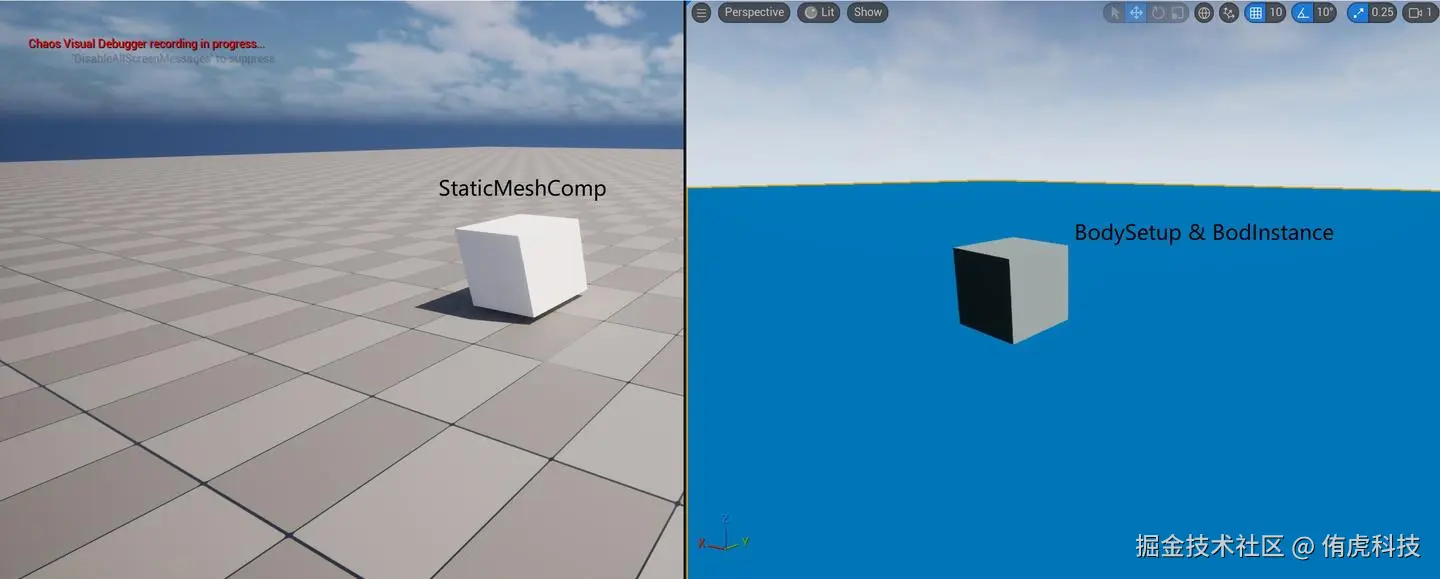 以常见的StaticMeshActor为例。下图左侧是Editor窗口,右侧是Chaos Visual Debugger看到的物理世界。