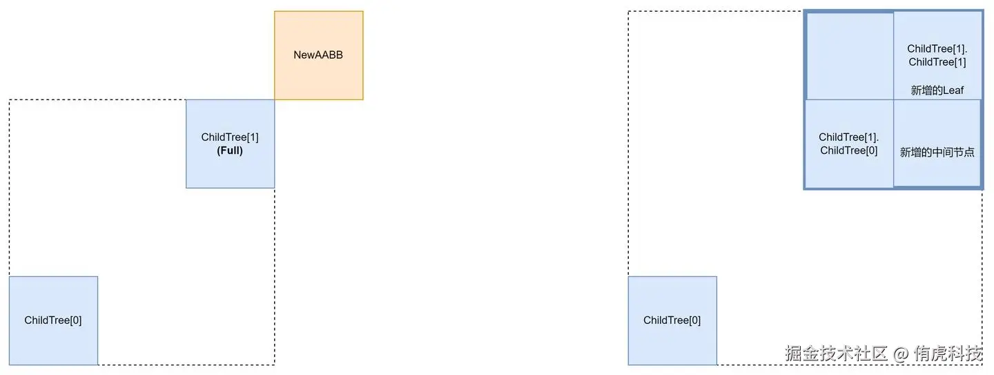 当BestSibling找到的叶节点已经满了,就无法直接添加,需要再新增两个Node,一个作为中间节点,另一个作为新的Leaf。之后同样要更新Leaf到根节点路径上所有Parent的BoundingBox。