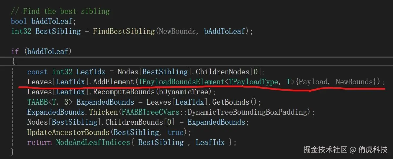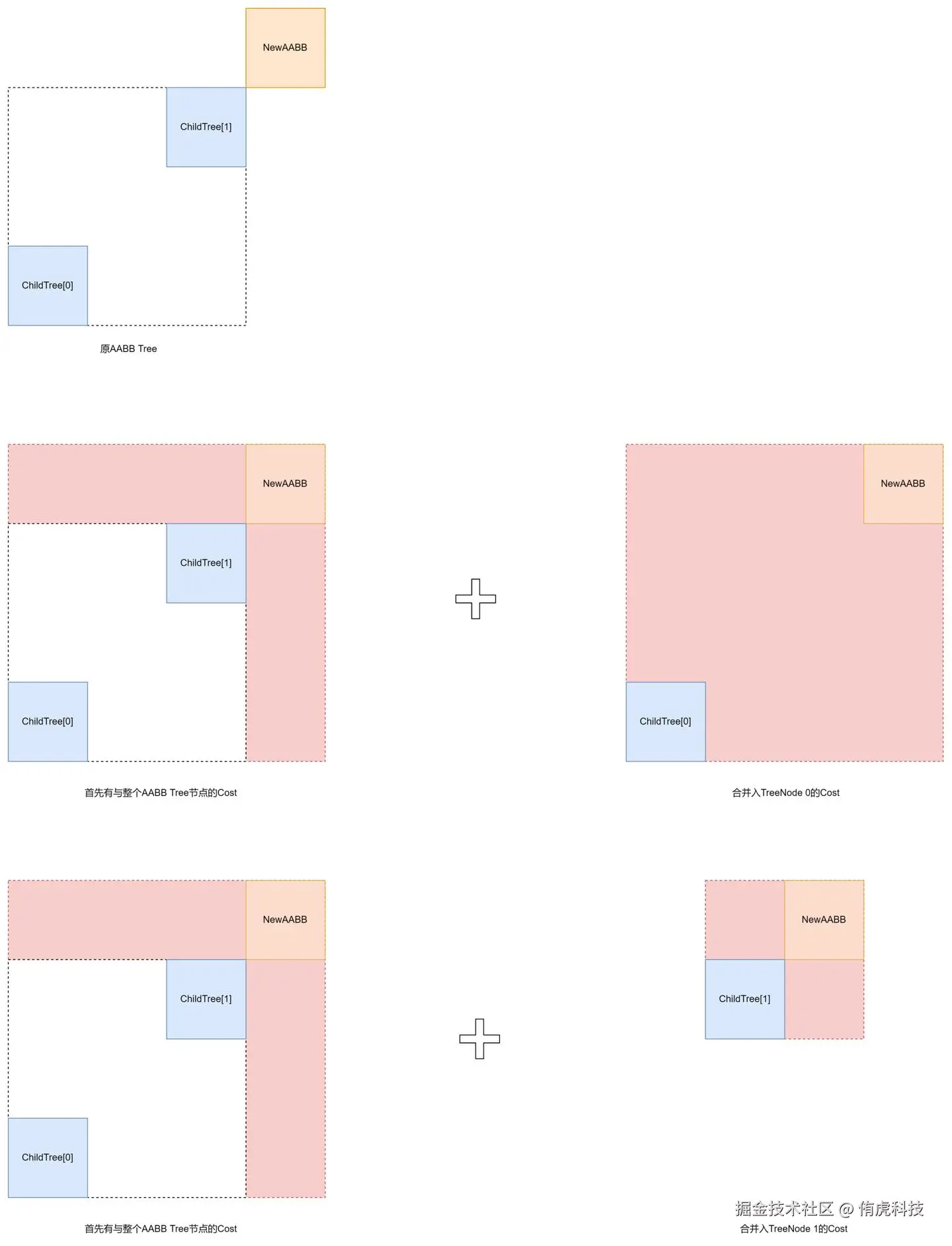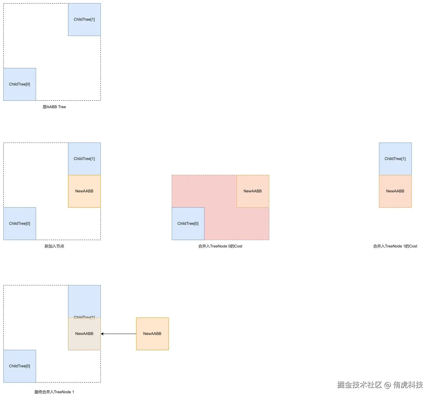 何谓“最合适”,加入新AABB,通常会使一些ChildNode的BoundingBox变大,需要使BoundingBox增加的体积尽量小,以此来判定“最合适”。这是一种启发式的方法,认为BoundingBox大小直接影响到AABBTree查询的效率,类似构建BVH使用的SAH表面积启发算法。这个寻找过程称为“FindBestSibling”。