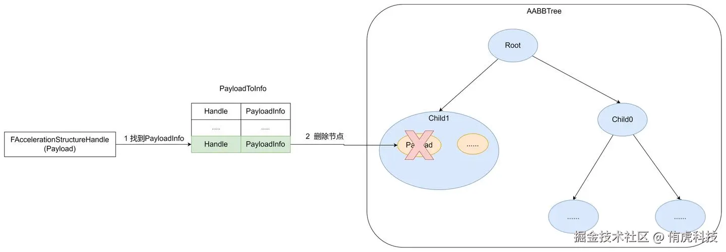 首先从PayloadToInfo中找到Payload所属的节点下标,然后从节点的Element数组里把Payload移除即可,并且把到根节点链路上的所有Bounds再更新一遍。