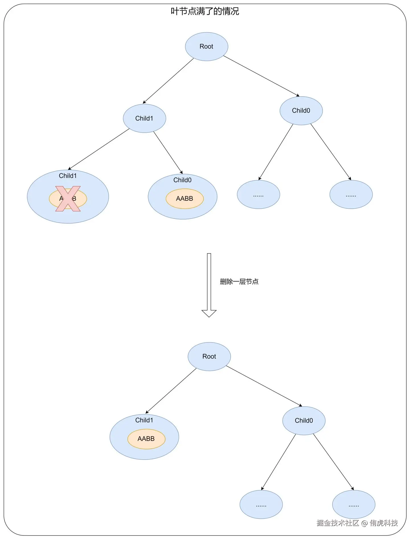 但是特别的,当叶节点删除Payload后整个都空了,就要精简一下AABB树了,把Parent节点和自己都删掉,然后Parent节点的位置放Sibling节点即可。