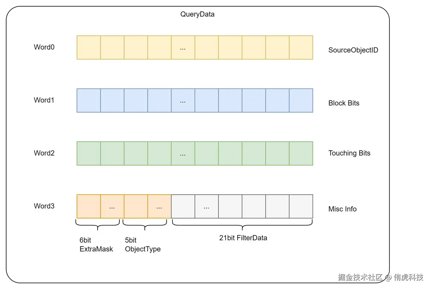此时这些碰撞设置还是一堆Bool和Enum,对于底层物理引擎存储不太方便,因此要把它们进行编码,最终会存入四个int32,用FCollisionFilterData表示。