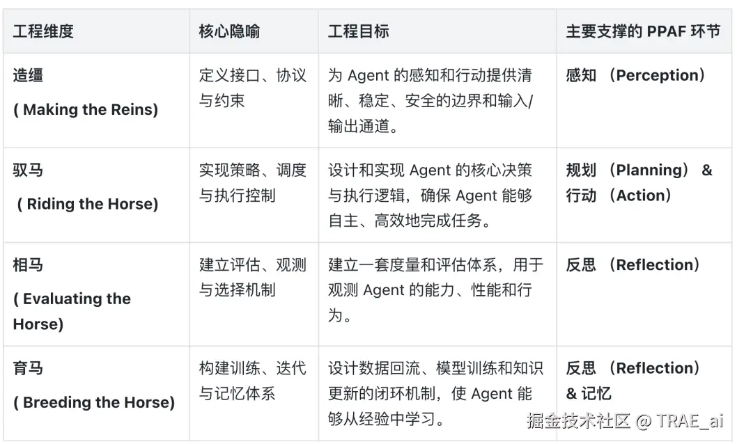 Harness Engineering 将 Agent 的工程化体系解构为四个核心维度,每个维度都与 PPAF 闭环的一个或多个环节紧密耦合。这四个维度共同构成了一个完整的 Agent “马具”(Harness),用于驾驭、约束和提升 Agent 这匹“智能之马”。