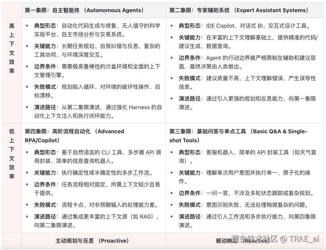 这个矩阵清晰地揭示了 Harness Engineering 的价值所在:Harness 的成熟度,直接决定了 Agent 应用能否从低效的、被动的第三、四象限,跃迁至高效的、主动的第一、二象限。