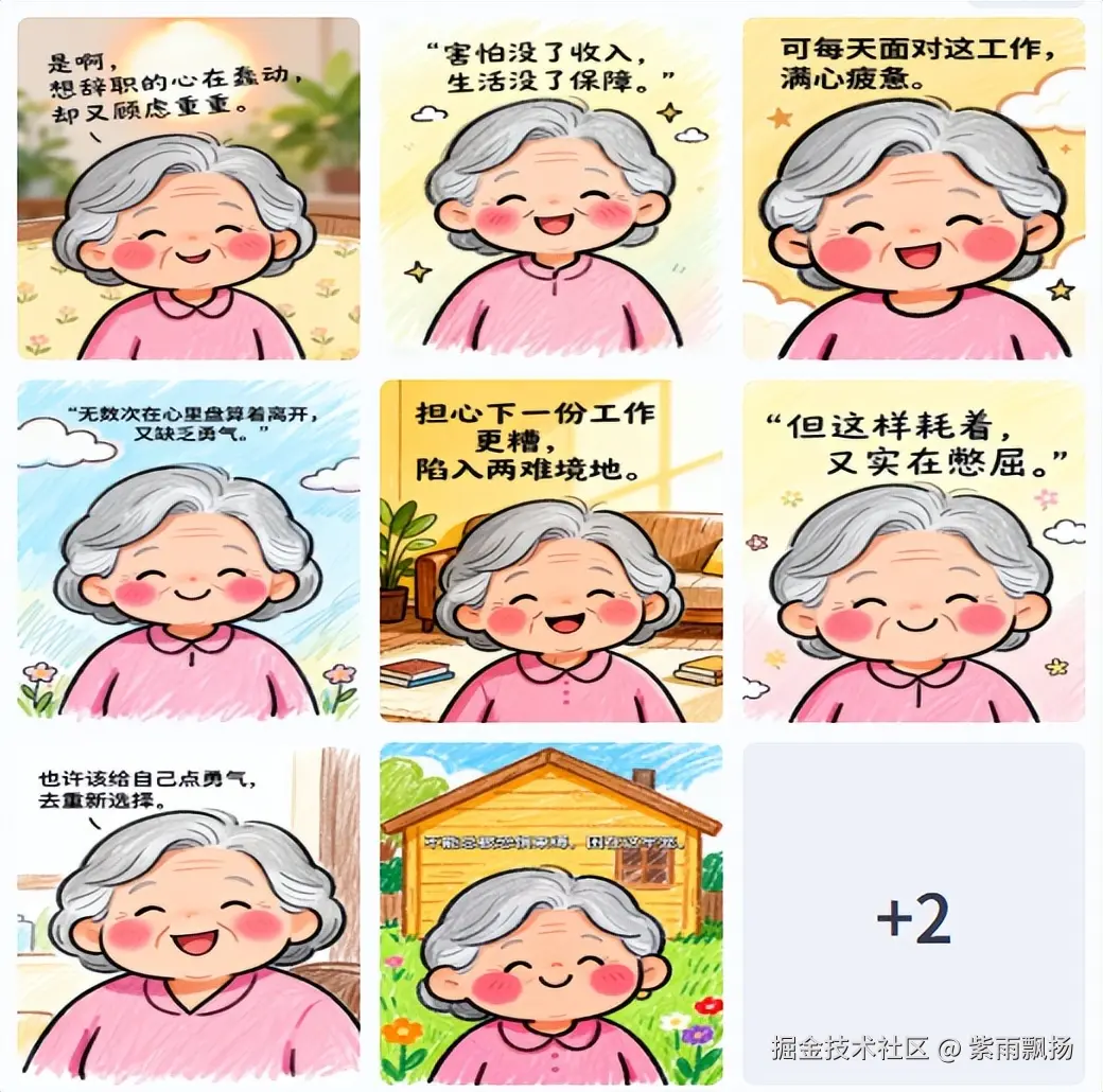 输入:Y头,你是不是想辞职又不敢,就自动生成一系列治愈系老奶奶图文