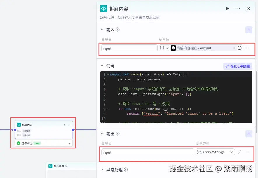 在情感内容的文案大模型后面添加一个扣子官方的【代码】节点->重命名为拆解内容->设置参数