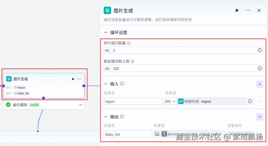 在代码(拆解内容)后面添加一个扣子官方的【批处理】节点->重命名为图片生成->设置参数