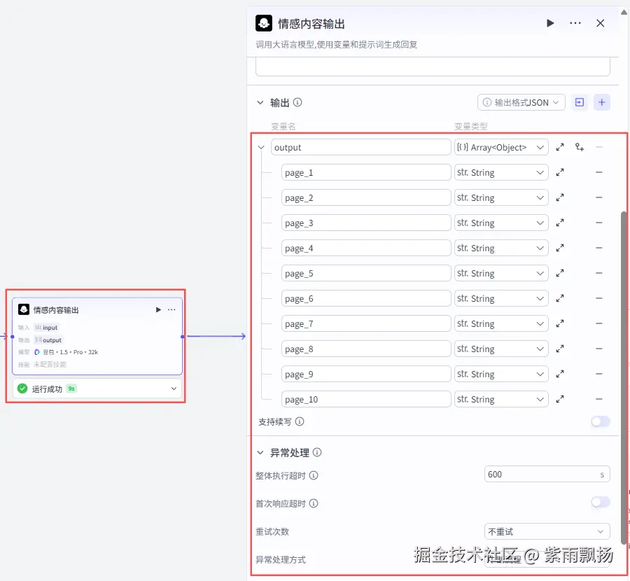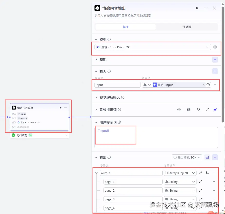 在开始节点后面添加一个扣子官方的【大模型】节点->重命名为情感内容输出->设置参数及提示词