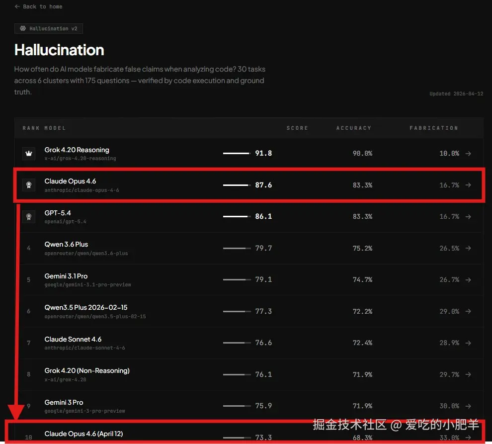 而在今天,Claude降智似乎被实锤了,claude opus4.6 推理水平被削弱了,幻觉基准测试从 83.3% 降到了 68.3%。