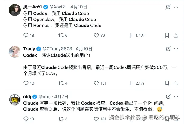 反正程序员已经用脚投票好了,打开 X 搜一下 "switched from Claude to Codex",那叫一个壮观,每天都有几十条告别信体的帖子:
