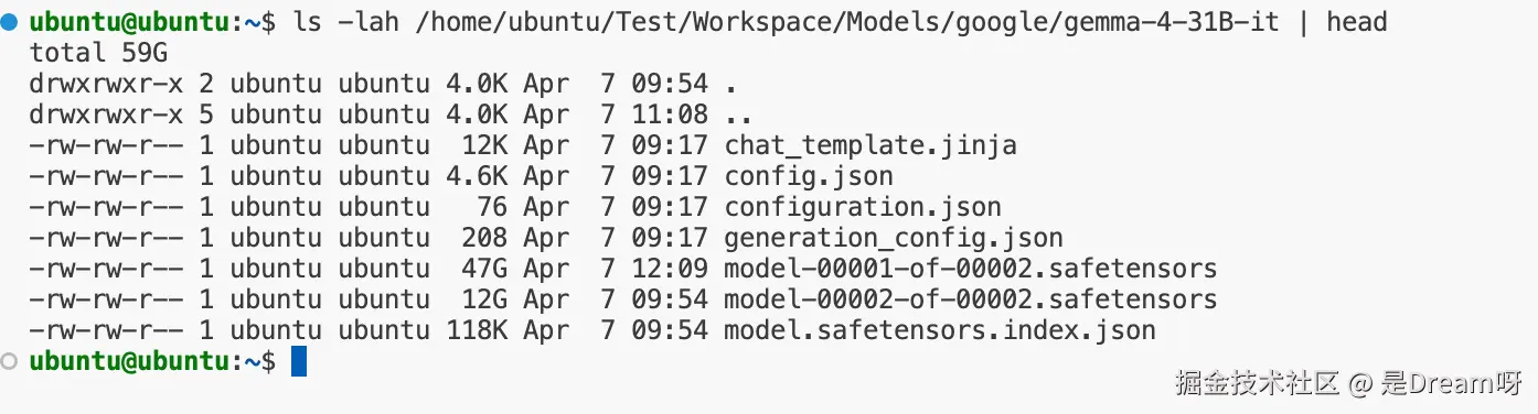 本文实验基于一台 Ubuntu 服务器完成,硬件侧使用 NVIDIA A100 80G GPU。部署前,服务器已完成 NVIDIA 驱动、Docker 与 NVIDIA Container Toolkit 的安装配置;模型运行采用 Gemma 4 专用 vLLM 镜像,目标模型为 google/gemma-4-31B-it,本地模型文件已提前准备完成: