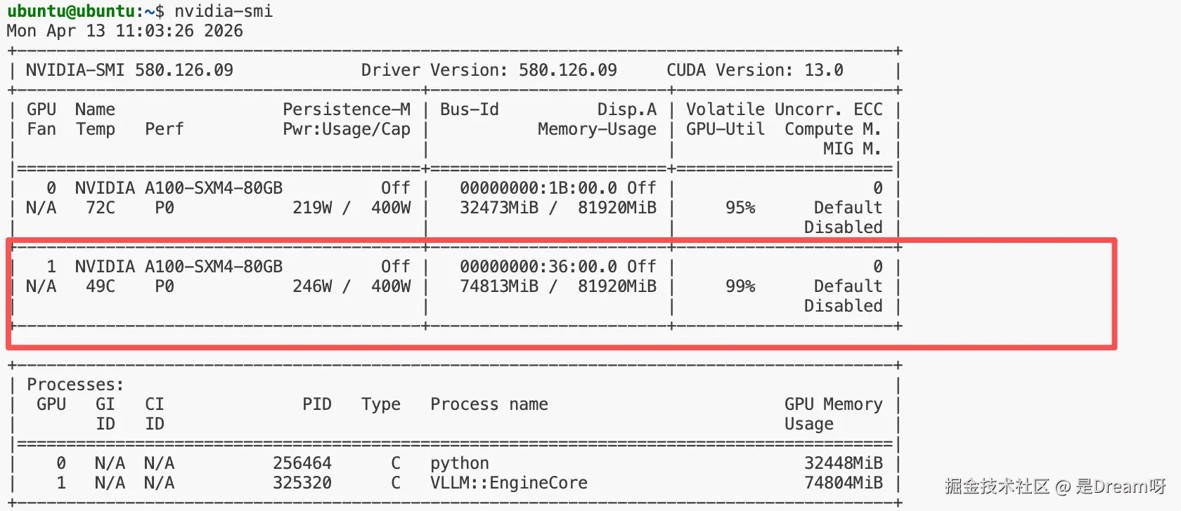 这里因为我的A100集群中有两张卡,第一张卡有别的用途,为了保证持久稳定的运行,我们只将模型绑定在第二张 GPU: