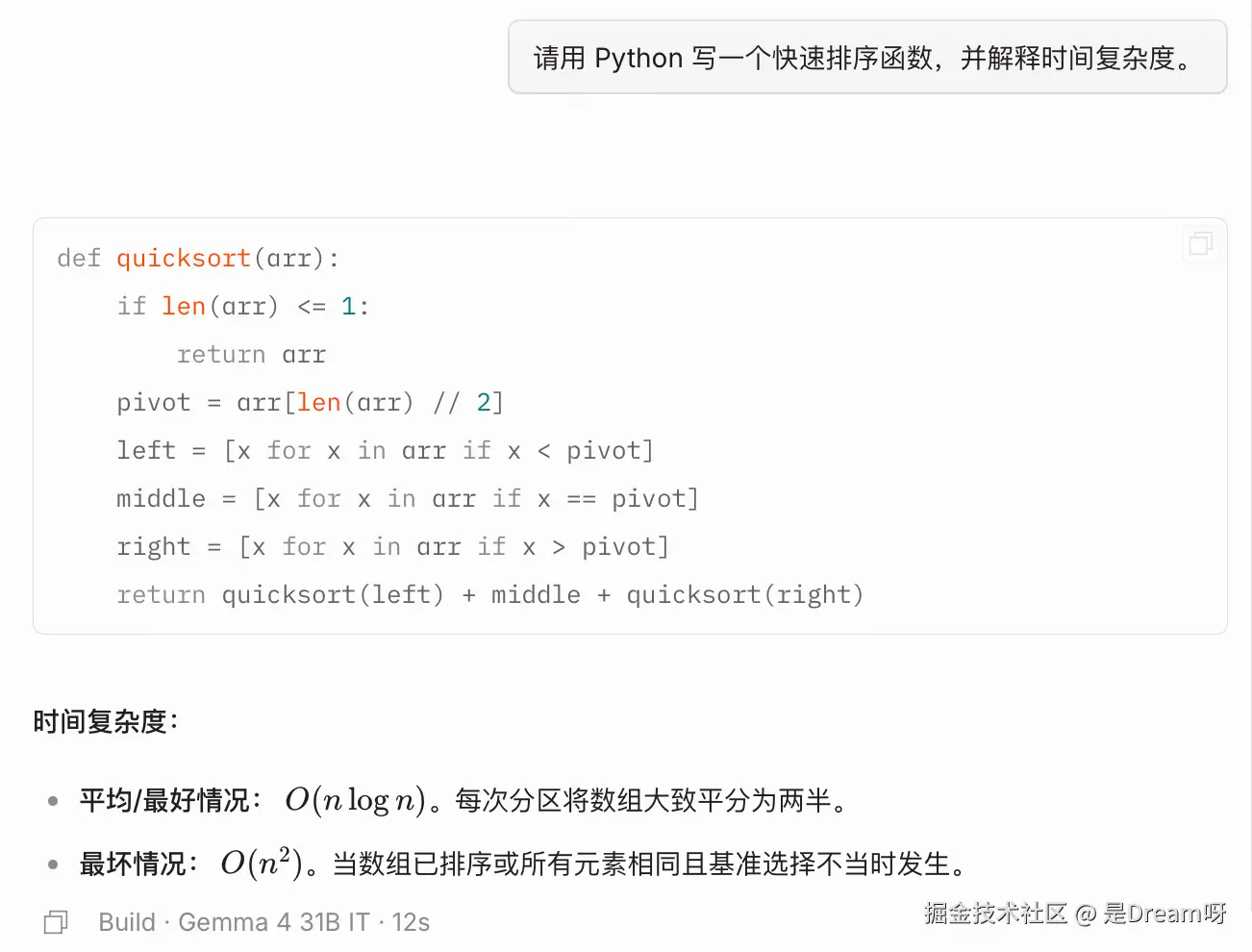 他能够直接给出可运行的 Python 版本快速排序实现,并且进一步说明平均情况、最好情况和最坏情况下的时间复杂度,可以看出较稳定的基础代码生成能力,能够完成常见的编程辅助任务: