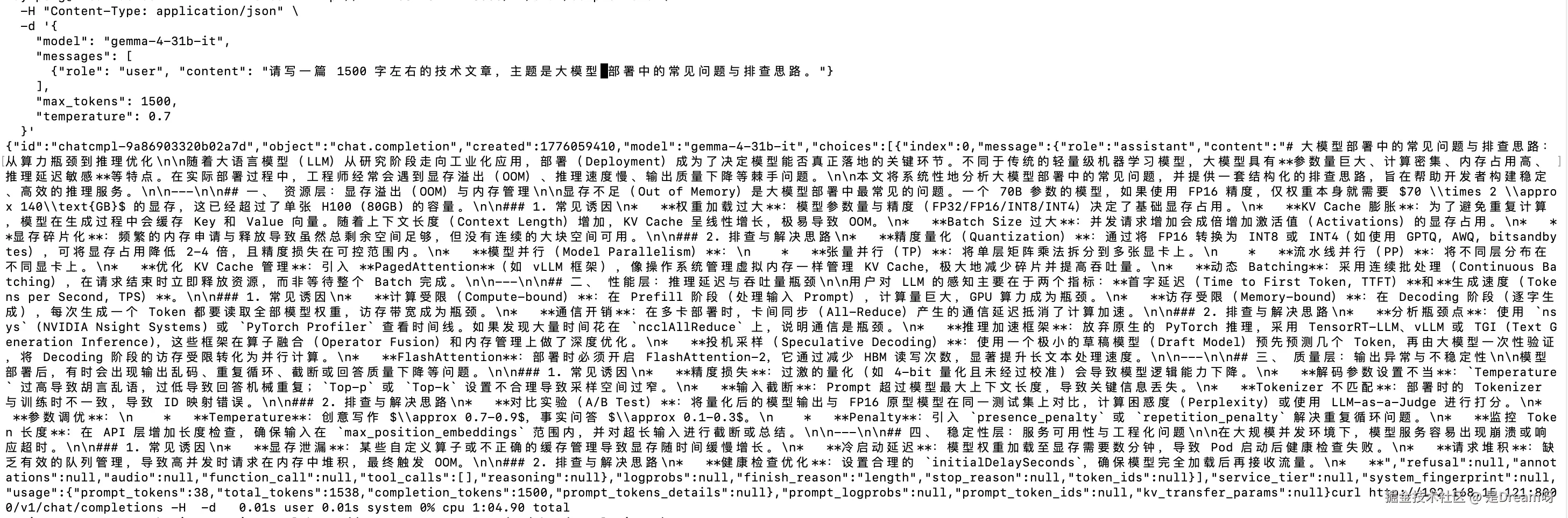 仅仅看回答质量还不够,部署完成后还需要关心一个很实际的问题:生成速度是否可以接受。 这里我采用的是最简单、也最贴近真实服务使用场景的方式:直接通过 curl 访问 /v1/chat/completions 接口,并在命令前加上 time,统计一次较长输出请求的整体耗时。