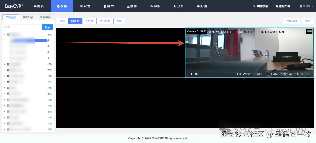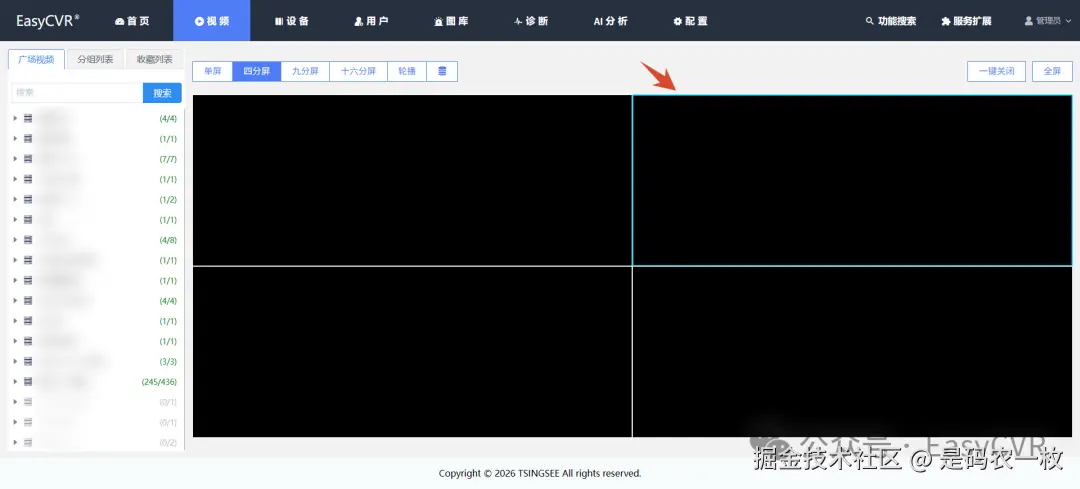 进入EasyCVR的视频播放页面,切换到四分屏/九分屏/十六分屏模式;