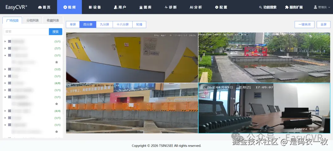 用过EasyCVR的朋友都知道,它的多屏播放特别好用——4分屏、9分屏、16分屏、轮播都很顺畅,工地、园区、工厂集中监控超方便。