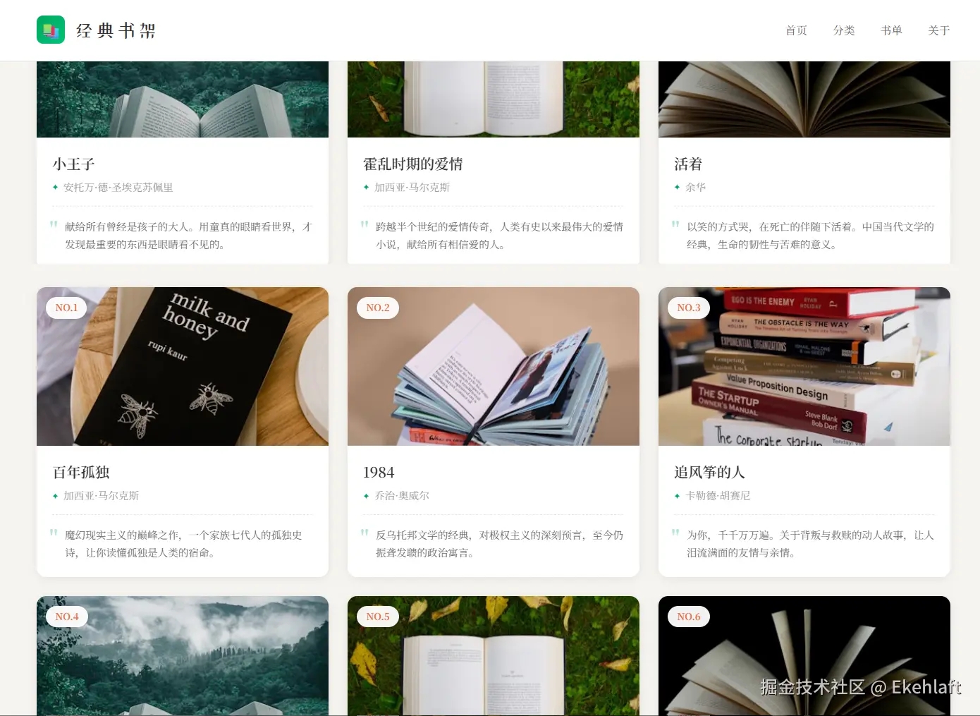 帮我做一个静态网页,功能是展示我读过的书,每本书有封面、书名、作者和一句话点评。风格要简洁清新,像豆瓣那样