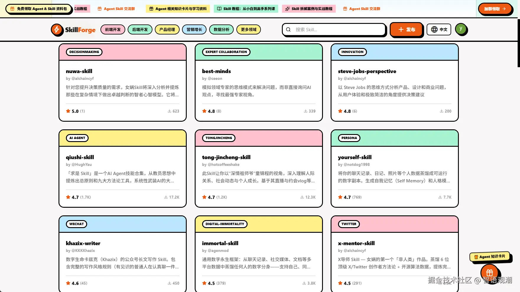 群里也经常有人问"有没有好用的前端 Skill""推荐一个写文章的 Skill",每次都得靠人肉推荐。
