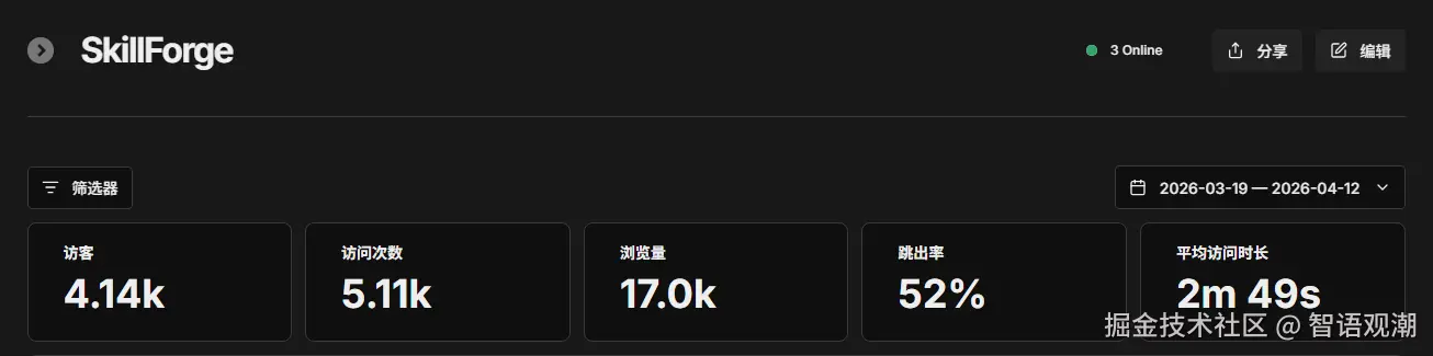 不只是数据在涨,用户也在涨。偶尔在推特上看到有人找 Skill,顺手分享一下链接,再加上群里口碑传播,半个月下来 4000 多个访客,1.7 万浏览量。