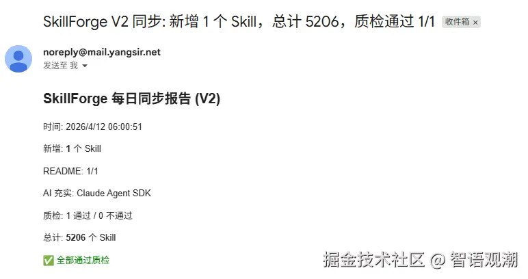 标题是"SkillForge 每日同步完成",内容很简单:新增 1 个 Skill,质检全部通过,0 个需要人工处理。