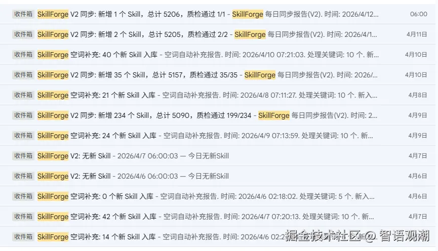 除了每天的同步,每周还有一轮存量质检,对数据库里已有的 Skill 重新检查一遍。相当于持续保养。