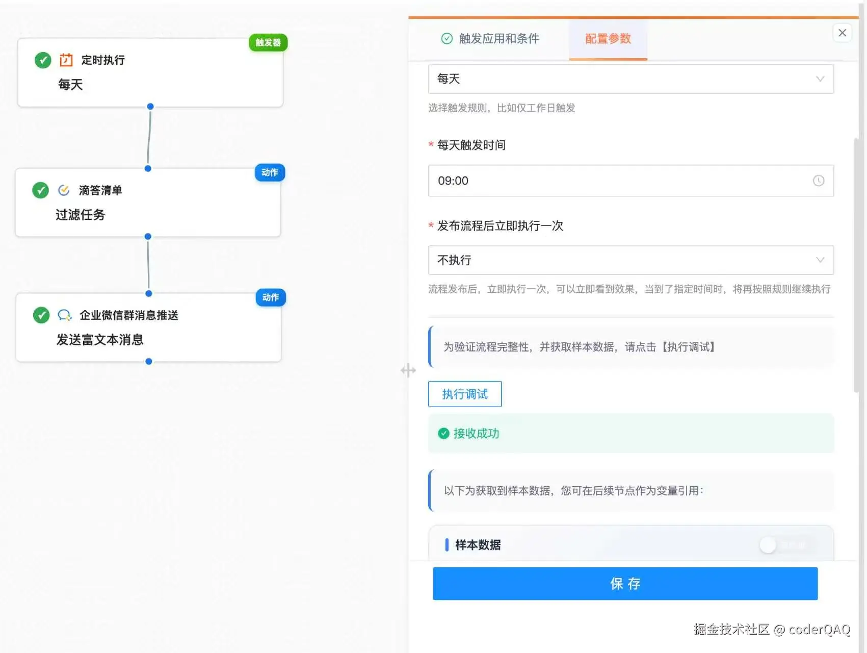 定时执行(设置固定提醒时间)→ 滴答清单(过滤待办任务)→ 企业微信消息推送 → 执行调试 → 上线流程 → 查看流程日志