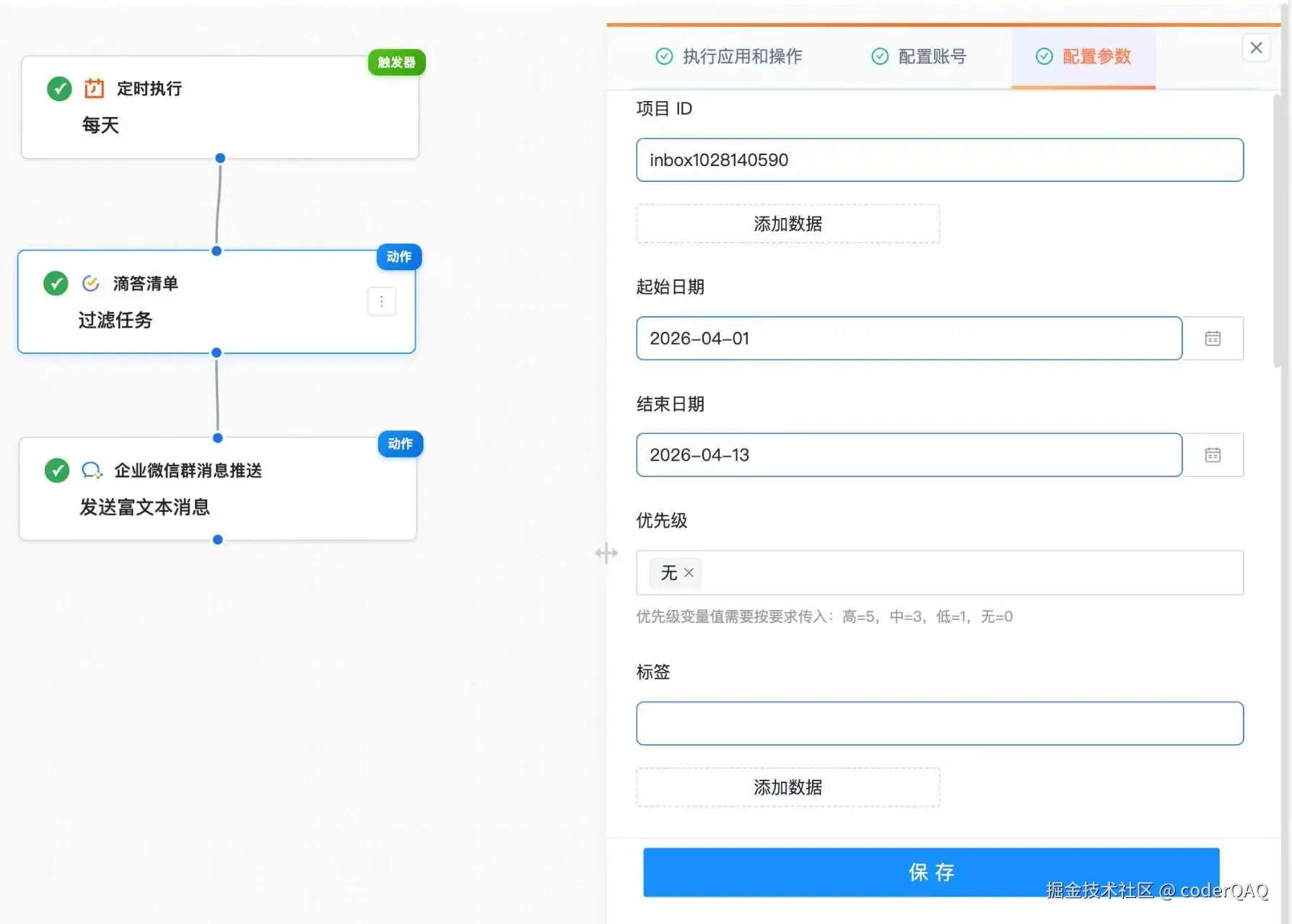 日常用滴答清单管理任务,常常会遗漏待办事项?借助连趣云零代码搭建自动化流程,就能实现定时抓取滴答清单待办任务,自动推送至企业微信,全程无需编写代码,配置简单、长效可用,新手也能快速上手。