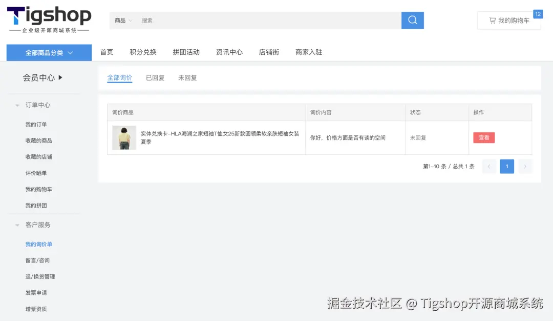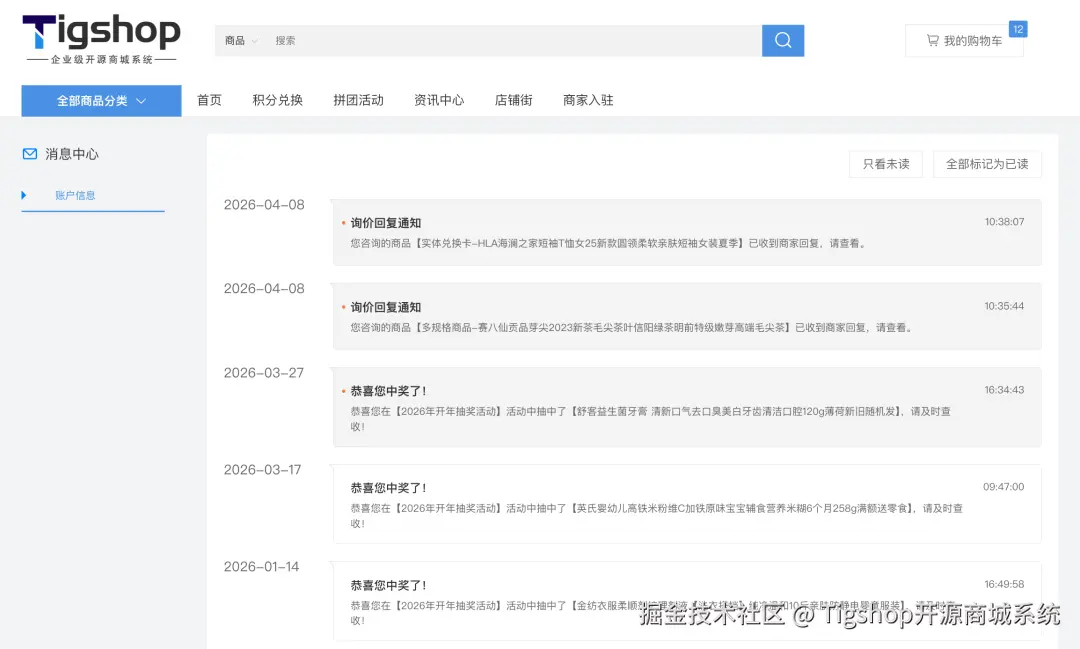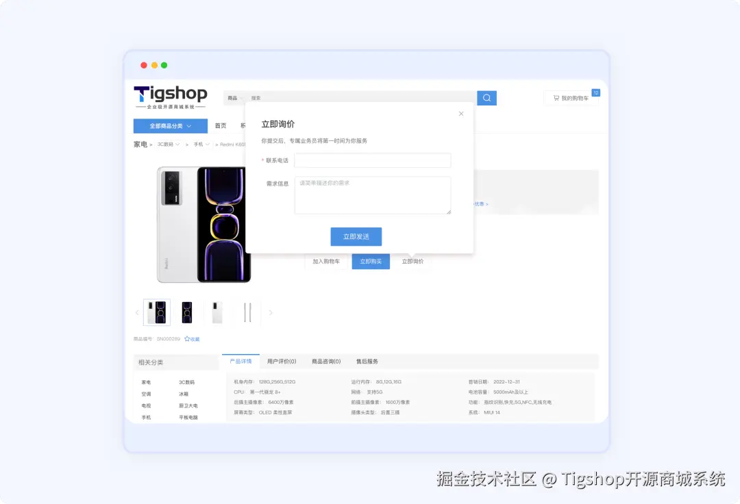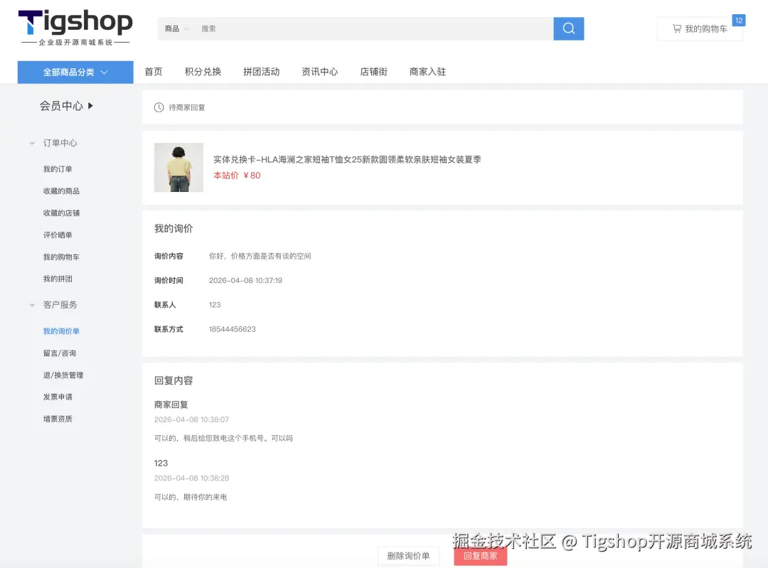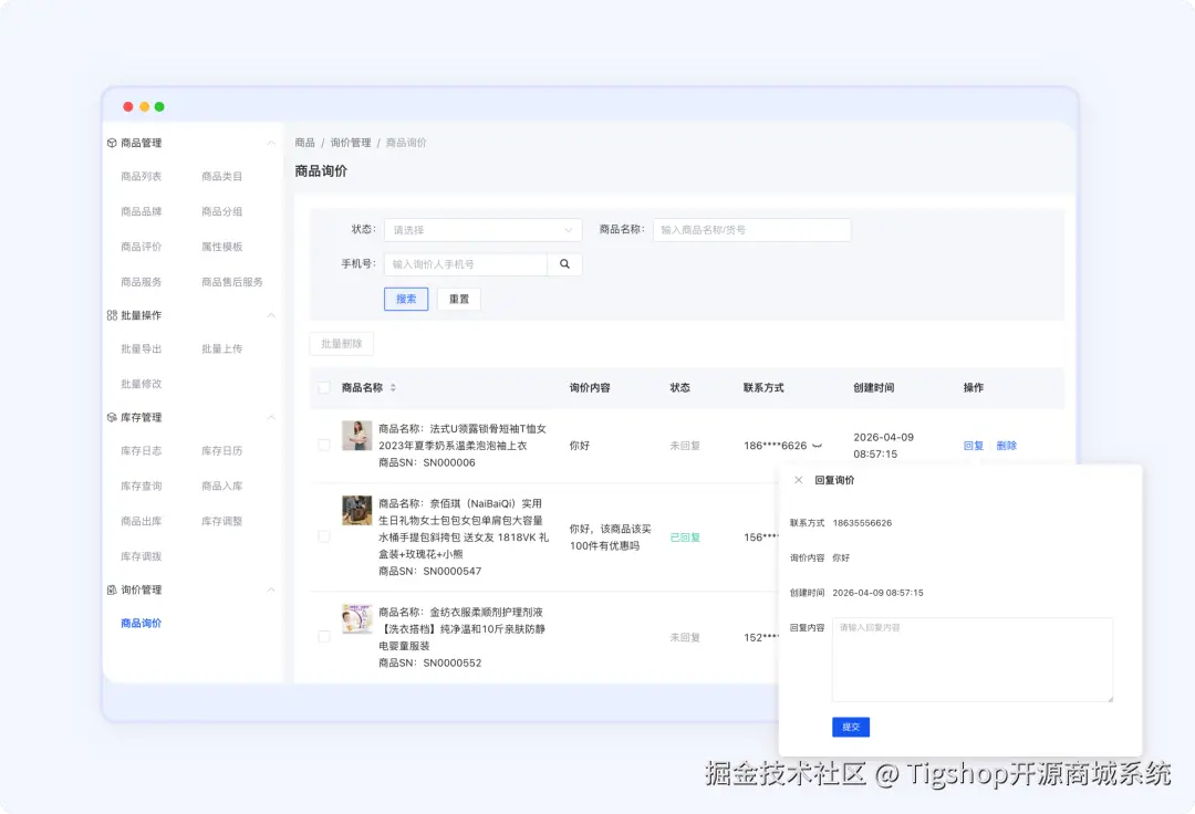 本次 Tigshop 开源商城系统全面升级“商品询价”功能,跨境版、供应商版、企业批发版、多门店版等四大版本同步支持。能有效解决沟通不及时、价格不透明、询价信息杂乱、消息易遗漏等痛点,支持商家与用户双向实时回复、商品价格直观展示、关键词精准搜索,搭配站内消息实时通知。