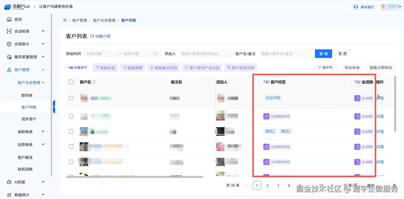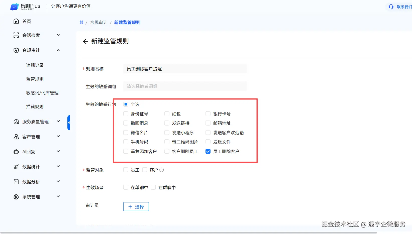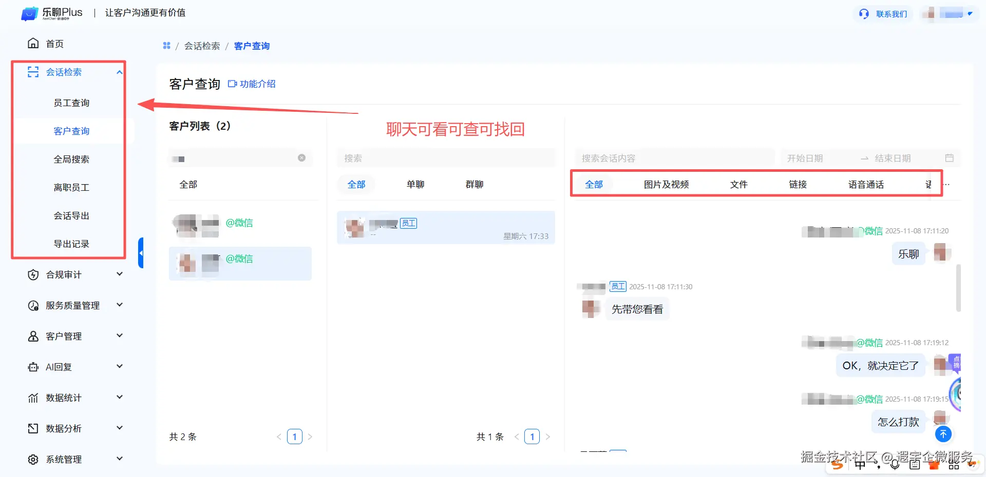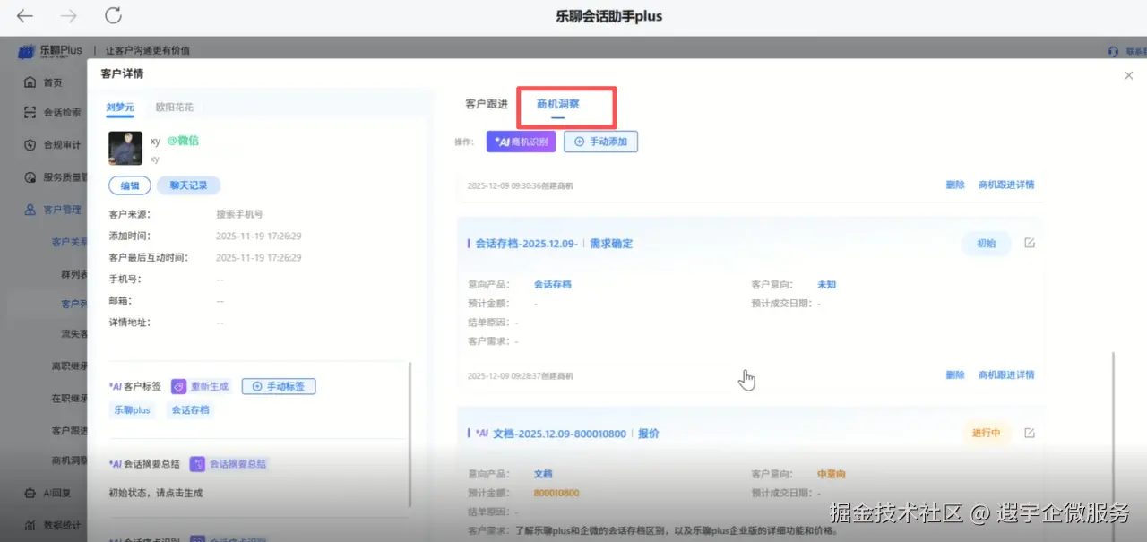 乐聊会话助手Plus企业沟通记录存档管理、客户服务质量管理、员工客户互动过程合规管控、员工敏感行为管理、删除客户提醒、回复效率提升等,支持多端使用、支持企业私有化部署!