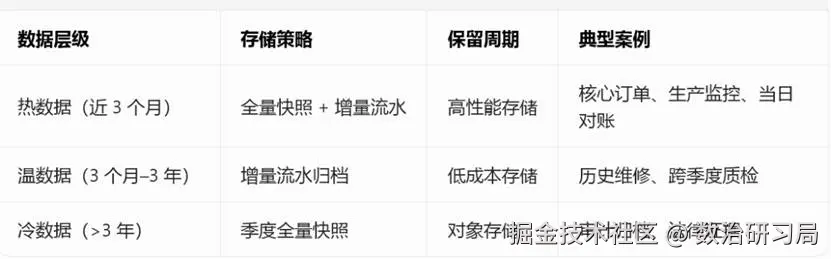 10 年实战总结:没有单一的 “银弹” 策略,只有 “冷热分级” 的组合拳。我们需要根据数据的访问频率和业务价值,来决定它的存储形态和保留周期。