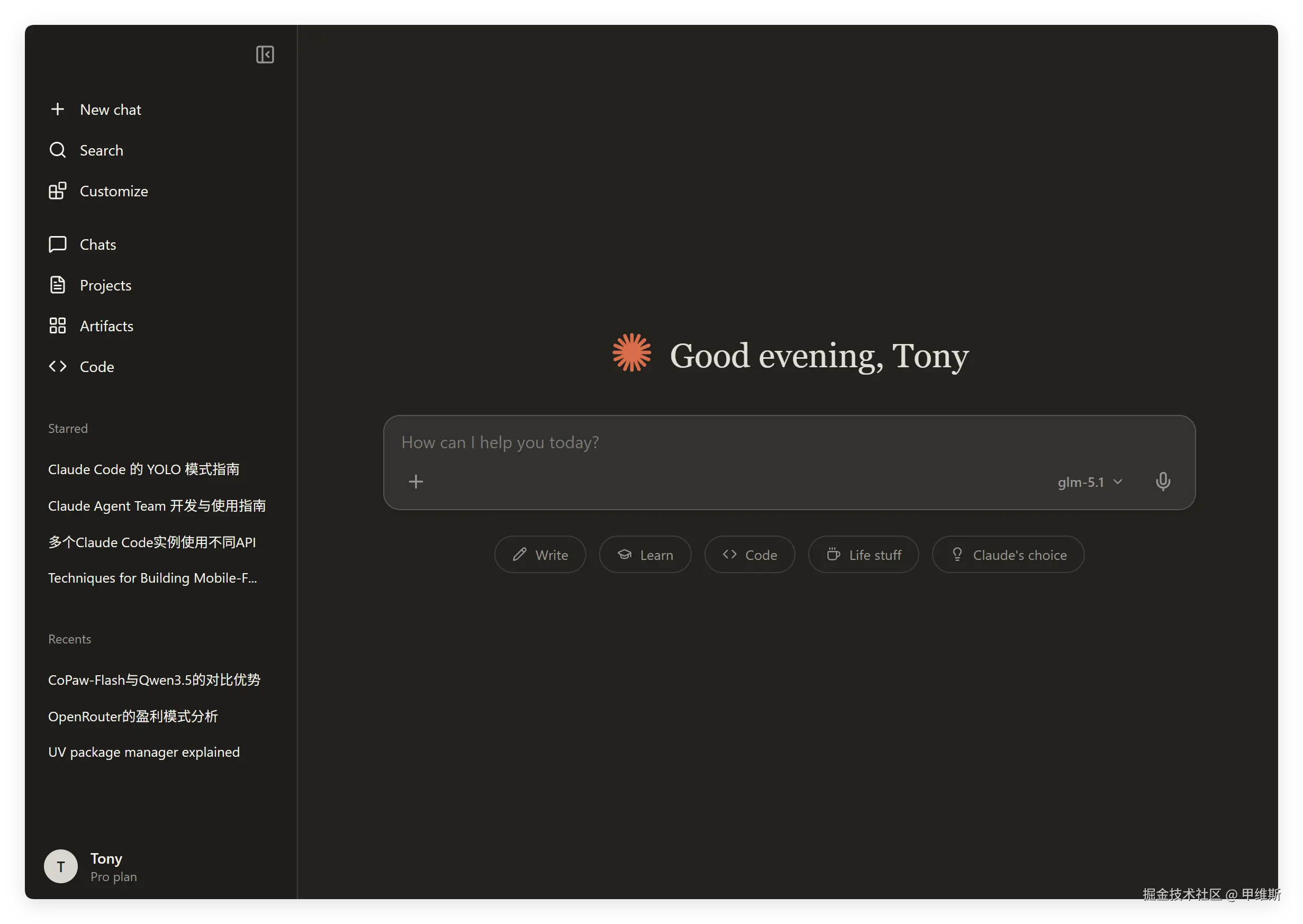 这个技术栈就不太一样了,而且我要求后端全部由 GLM 替代,实现完整的对话管理。目的就是做到 Claude Desktop 的外壳,GLM 的内核。