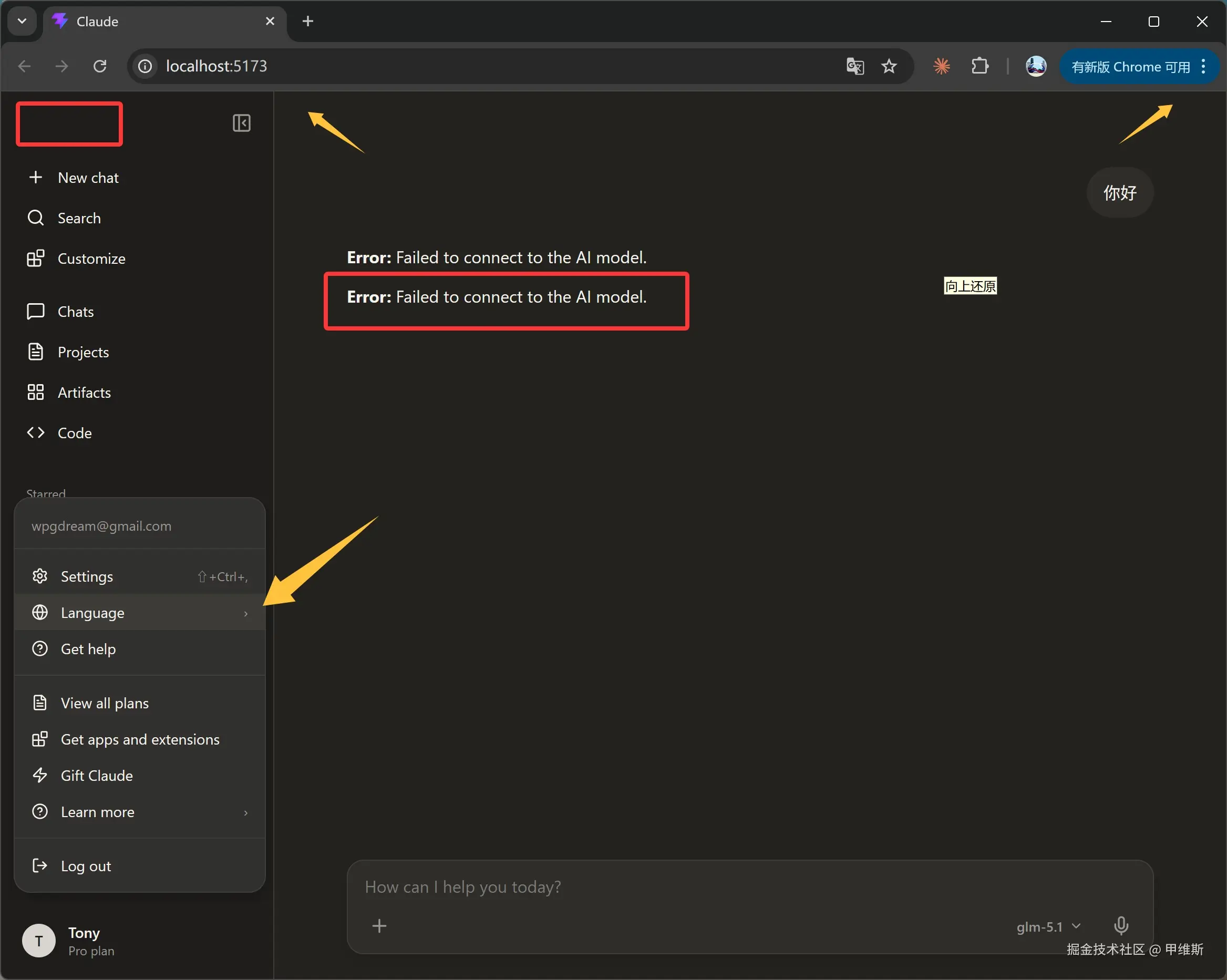 缺了很多东西,比如作家的“Claude”没了,语言的弹出菜单没了,左下角的对话标题和右上角的分享没了。
