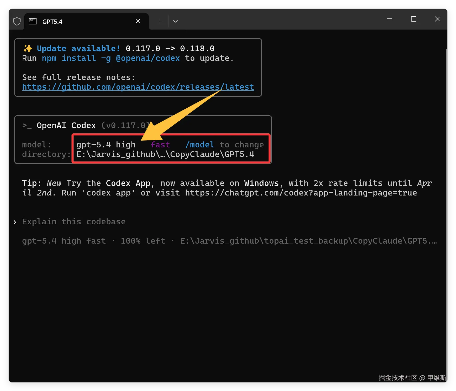 从图中可以看到,模型选用了 gpt-5.4 high fast。
