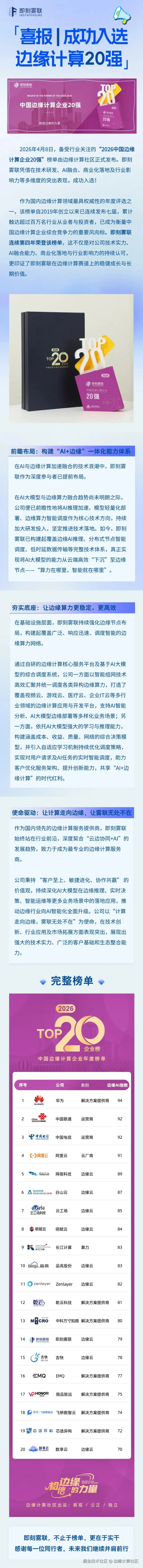 即刻雾联荣登“2026中国边缘计算企业20强”榜单
