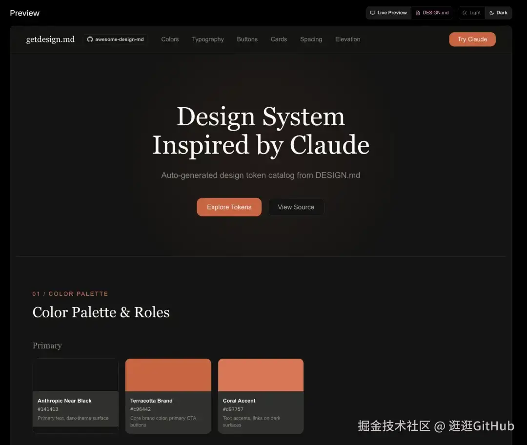 另外每个品牌文件夹里还自带 preview.html 和 preview-dark.html,直接在浏览器里打开就能看到色板、字体、按钮、卡片的实际效果,明暗两套主题都有。